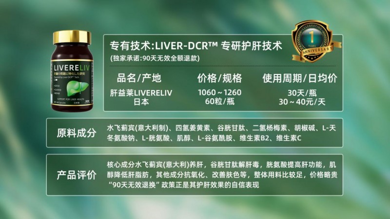 从专研体系上来说,Liver-DCRE™&iSynergies™成分体系核心优势是:意大利进口水飞蓟宾纯度高达89.6%(普通产品仅在60%~70%),可以穿透肝细胞膜清除自由基,促进细胞修复;还原型姜黄素配合同盛BioPerine®专利胡椒碱有效避免普通姜黄素易被氧化的问题,使得生物利用度达到3倍-5倍。