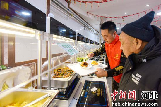 图为廊坊市广阳区万庄镇社区长者智慧食堂,工作人员在协助老人就餐。 付瑞琪 摄