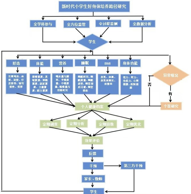 为更高效地赋能学生,项目组历经2年研究,对51480个有效数据基点进行统计分析,形成贴合日常实际的可复制的成果,精准织牢“好身体”防护网。在防范和改善校园“小胖墩”“小眼镜”“小抑郁”等问题上综合施策,在学生形态培养、体能培养、营养干预、睡眠管理、BMI监测、身体功能等方面长期监管,比选出“好身体”培养应当遵循的有效措施60条,连续坚持30天,锤炼精神,锻炼气魄,凝练神态,让身体的内环境朝着更好的方向质变,促进“好身体”意识的生成。
