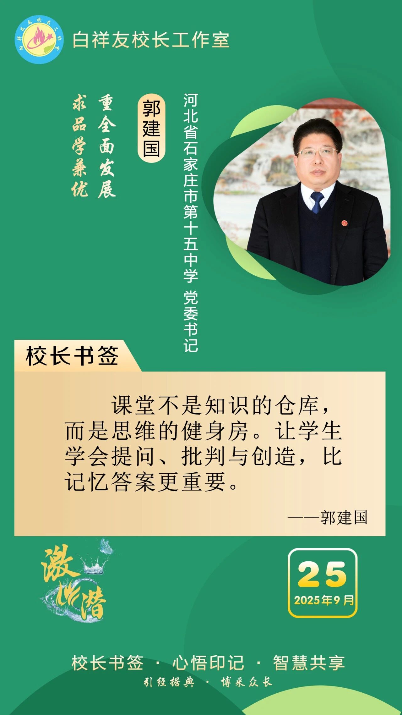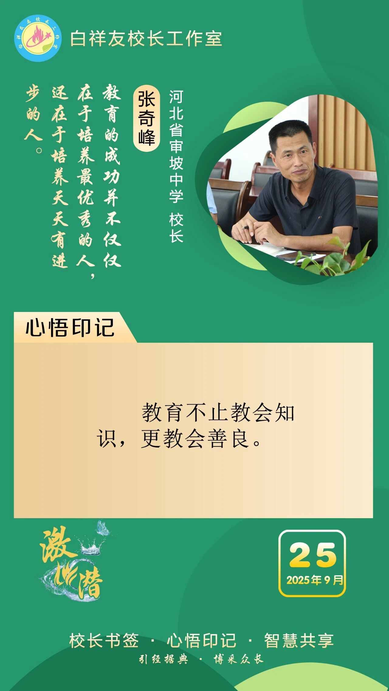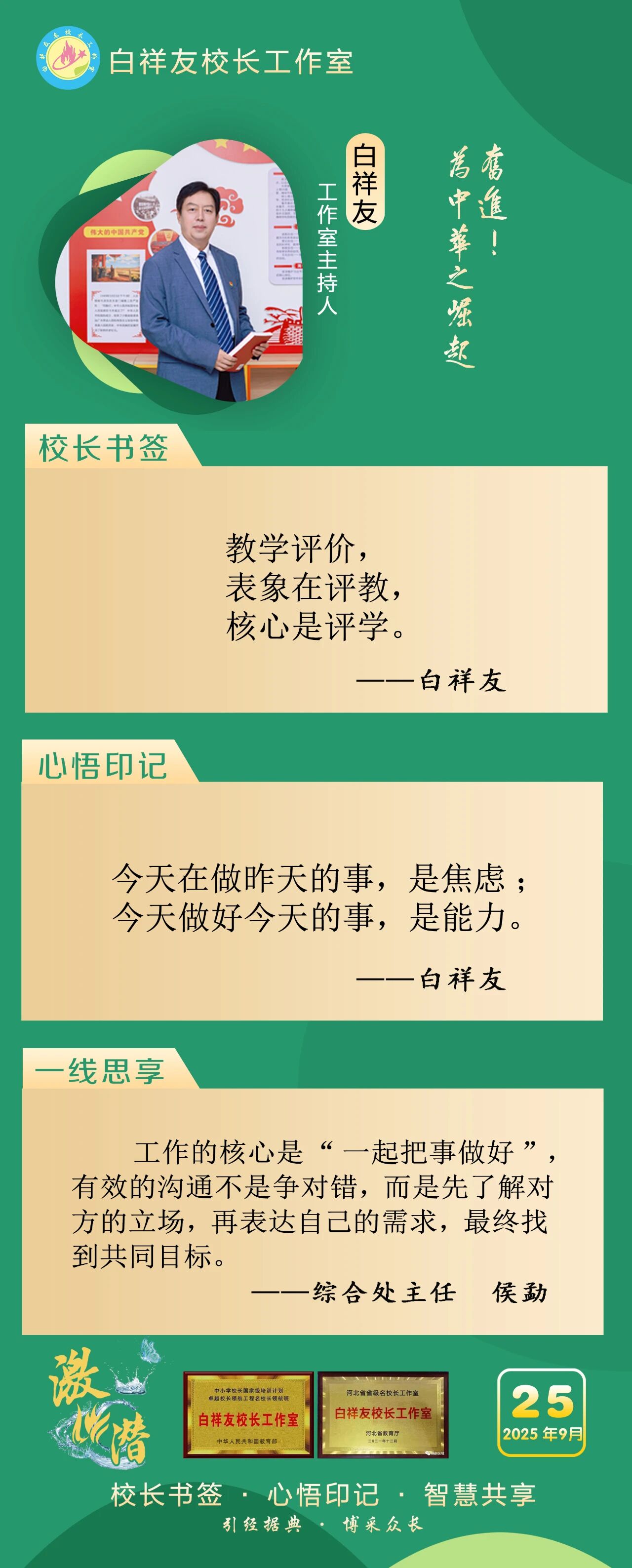 “白祥友校长工作室”成立于2019年4月,是教育部“国培计划”中小学名校长领航工程、河北省首批名校长工作室,目前省内外成员校59所。工作室坚持“资源共享、智慧共融、互助共赢”理念,已成为思想碰撞的交流场,资源共享的品牌站,成果展示的辐射源。 点赞 +1 微博 微信 我要评论 发布 相关推荐 祝贺!衡水十三中学子省赛获奖 教育大观 1天前 白祥友校长工作室成员新疆实验中学冯永庄校长一行来衡水十三中参观交流 教育大观 3天前 春日里,衡水十三中学子“抢”个痛快,“拼”出花样! 教育大观 6天前 衡水市委管理干部学习贯彻党的二十届四中全会精神研讨班开班 政情 03-19 全市一等奖!衡水十三中激潜教育再结硕果 教育大观 03-17 巾帼筑梦绽芳华 向光而行建新功 河北衡水中学举办第十八届“杰出女教师”表彰大会 资讯速递 03-09 衡水十三中学子这样追“锋”! 教育大观 03-06 马力加载,衡水十三中学子元气回归! 教育大观 03-05 热门 一天 三天 一周 1 微改革激发新活力 微创新助力大发展——衡水市扎实推进改革创新工作走深走实 2 【新闻发布】 创新招商促落地 深化服务提质效 衡水市持续打造投资兴业热土 3 春菜上新 衡水市区超市“鲜”意十足 4 衡水发布27个重点招商产业 聚焦县域特色精准发力 5 我市全方位营造安心舒心消费环境 全年累计使用补贴资金8.3亿元 带动消费61.3亿元 6 衡水滏阳路:美人梅盛开 繁花似锦 7 衡水市举办主城区网络餐饮食品安全培训会 8 故城:百人太极展风采 全民健身焕新颜 9 阜城码头镇:运河岸边焕新颜 乡村颜值气质双提升 10 全国学雷锋活动示范点衡水公交18路队:服务不是喊口号,是把乘客没想到的提前想到 1 一碗免费热食 暖了衡水的烟火人间 2 衡水市各部门各单位有力有序开展树立和践行正确政绩观学习教育 3 衡水桃城区城东社区开展“世界水日”主题宣传活动 4 “入企探岗”+“直播带岗” 衡水市“春风行动”线上直播招聘活动创新出彩 5 河北各地各部门各单位扎实开展树立和践行正确政绩观学习教育 6 【乡村行 看振兴】“老咸菜”里的乡愁——走进武邑县冀京农粮食种植专业合作社 7 衡水市2026年上半年全国计算机等级考试本周末开考,市教育考试院发布考前温馨提示 8 深州市庄火头村:人勤春早管桃树 精耕细作盼丰收 9 故城董学村:赓续千年文脉 绘就振兴新景 ——我市文化建设走笔之二 10 让百姓在家门口看好病 ——河北省聚力建设紧密型县域医共体 1 “白牌”电动自行车还能骑吗? 衡水晚报“帮办”核实:已全面禁行,违规上路会受罚 2 高职单招考试3月21日开考 衡水9300余名考生将参加考试 3 探秘气象“大本营” 解锁防灾新密码 饶阳县气象局举办世界气象日科普开放活动 4 【新闻发布】锚定便民利企目标 衡水发布2026年自然资源营商环境新蓝图 5 【新闻发布】聚焦科技赋能 衡水绘就营商环境新图景 6 315金融观察|大地财险罚单密集落地,暴露合规短板 7 以鱼养水净河道 2万余尾草鱼苗放流滏阳河衡水市区段 8 枣强县第四届杏花文化宣传推介会邀您共赴春日之约 9 2026年1-2月份主要经济数据公布 全省经济起步有力 10 沃土育新苗 科创结硕果——探访河北威昌佳泰实业有限公司 广告 广告 广告 24小时 1 白祥友名校长工作室 | 激潜教育探索随笔(第787期) 2 “创赢未来”2026创业大赛衡水选拔赛开始报名了 3 泰州科举院试文化文物展走进衡博 4 衡水市完成全省首个公共数据产品交易 公共数据收益缴入国库 5 孙敬学堂:深耕礼孝传承 筑强研学高地——我市文化建设走笔之三 6 仅用两分钟 衡水交警紧急开道护送断指伤者就医 7 【乡村行 看振兴】科技种出“新花样”——探访桃城区衡水国际设施园艺产业园 8 河北衡水:全民健身 燃动湖城 系列④ —— 乒动湖城 国球飞扬 9 再攀高峰!中国人寿2025年总保费首破7000亿,同比增长8.7% 10 【凝心聚力 真抓实干 奋力实现“十五五”良好开局】锚定建设农业强国目标 提升农业综合生产能力