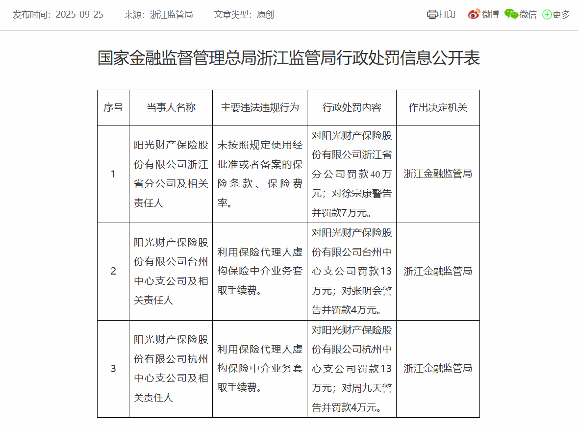 阳光财产保险股份有限公司浙江省分公司及相关责任人因未按照规定使用经批准或者备案的保险条款、保险费率被处罚,浙江金融监管局决定对阳光财产保险股份有限公司浙江省分公司罚款40万元;对徐宗康警告并罚款7万元。