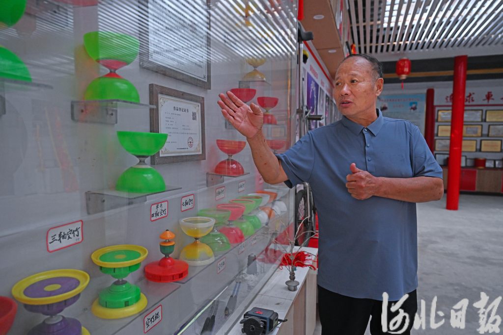 9月21日,吴桥丰耀杂技魔术道具有限公司总经理周文明展示用于杂技演出的空竹。河北日报记者 张 昊摄