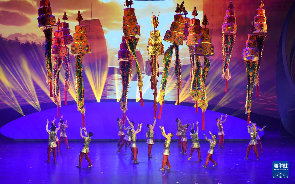 杂技演员在表演《龙跃神州——中幡》。图片来源:新华社