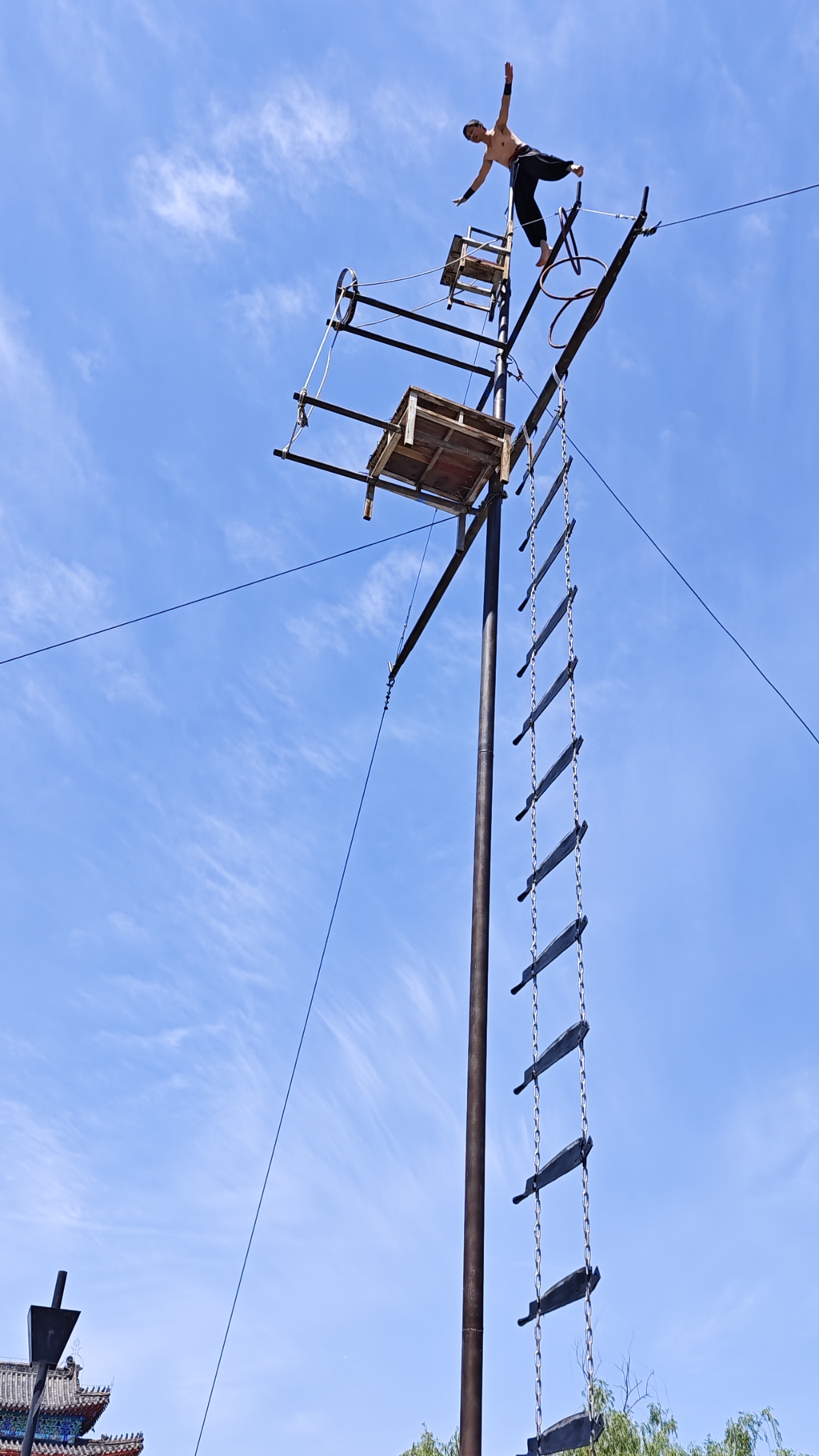 在吴桥杂技大世界“天桥把式广场”,李亮在表演“上刀山”。图片来源:澎湃新闻