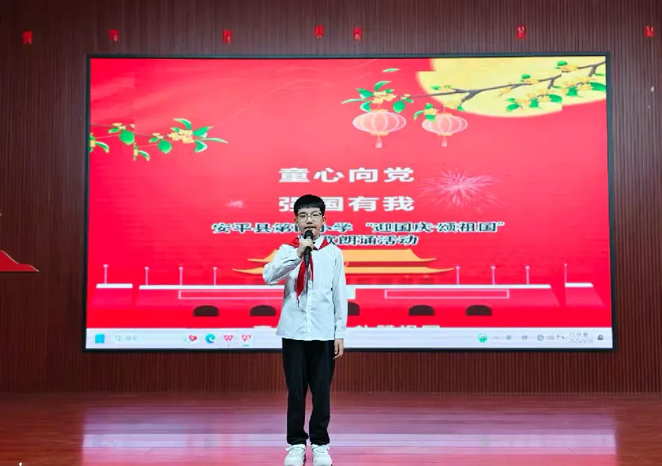9月29日上午,安平县第四小学还举办了以“童心向党,强国有我”为主题的诗歌朗诵比赛,参赛选手们朗诵了《如果信仰有颜色》《写中国》《我爱你,中国》等诗歌。他们精神饱满,语调时而激昂、时而深情,将对祖国的热爱融入每一句诗词,师生们也在文字与声音中感受着浓浓的家国情怀。