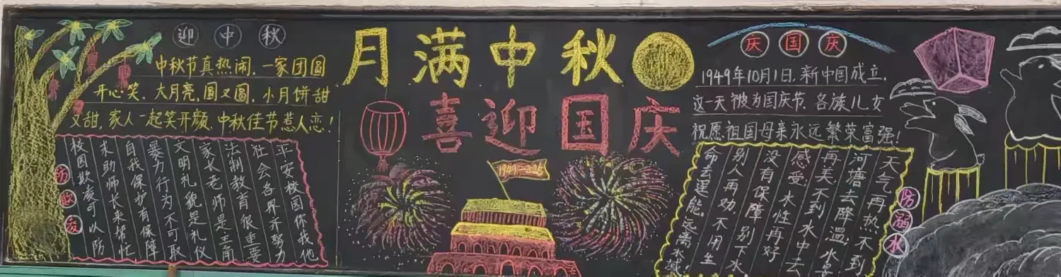 “国庆遇中秋”主题黑板报展示活动中,各班发挥创意,将国庆元素与中秋特色巧妙结合。有的班级用灯笼、月亮图案搭配;有的以“月满中秋,喜迎国庆”为主题,绘制天安门与圆月同框的画面。教室里的黑板报色彩鲜明,内容丰富,成为校园里一道独特的风景线,吸引着学生驻足观看。