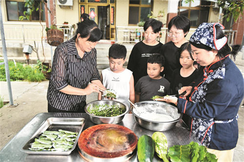 赵凤鸣(左)在农家院中教孩子们包桲椤叶饼。