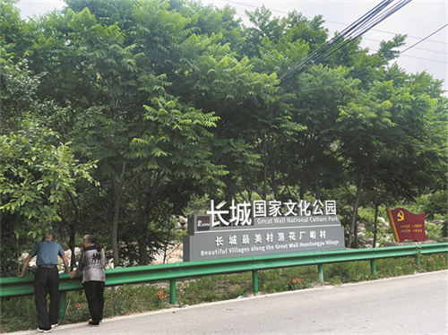 村民驻足在“长城最美村落花厂峪村”牌匾旁。