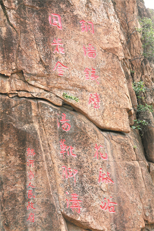 刻在岩壁上的“铜墙铁壁花厂峪,固若金汤靴脚沟”。