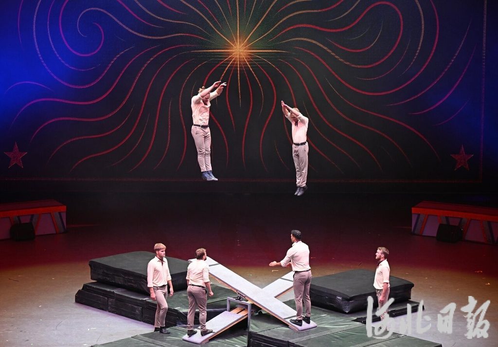 9月29日晚,吴桥东方杂技城座无虚席。第二十届中国吴桥国际杂技艺术节A场演出在这里举行。图为《丹麦双层跳板》节目。河北日报记者 张昊摄