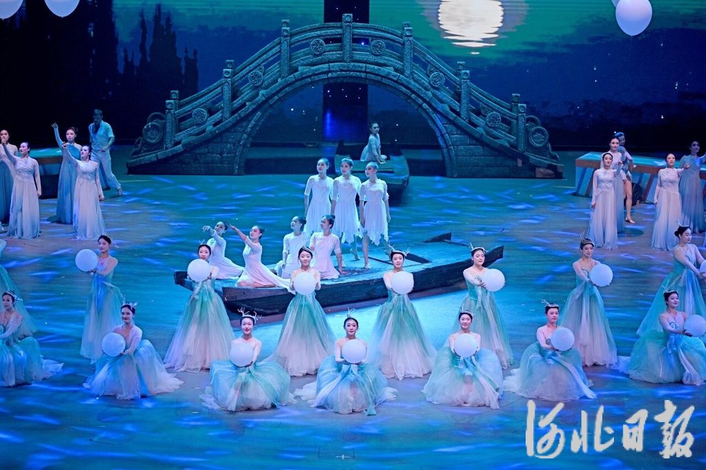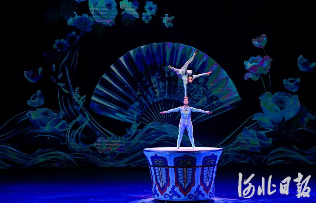 9月28日 ,“为人民绽放——国家艺术基金优秀杂技节目展演”在吴桥江湖大剧院举行。图为四川省遂宁市杂技团的演员们在表演《熠熠生辉——顶碗》。河北日报记者 李东宇摄