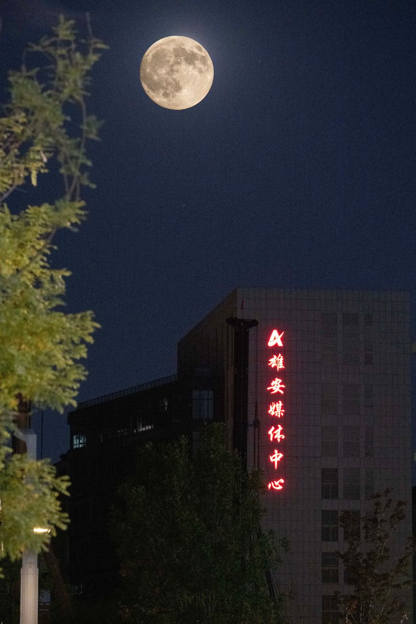 10月6日晚,中秋圆月悬挂在雄安媒体中心大楼之上。雄安媒体中心王伟倩 摄(二次曝光)