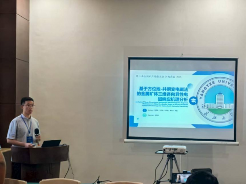 在“地面及井中矿产勘查技术及应用”专题会上,井观科技团队成员李昊锦以“地-井瞬变电磁各向异性响应研究”为题作了专题报告。报告指出,随着电磁勘探技术逐步由定性解释迈向定量反演,面对复杂地质结构中各向异性响应的精准提取难题,唯有通过构建高精度正演模型、深入分析各向异性介质中的电磁响应特征,才能为实现深部矿产资源的精准定位与高效勘探提供关键理论支撑。