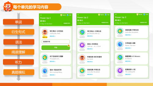 1.官方教材保障考点精准:采用剑桥官方指定《POWER UP》《THINK》教材,覆盖0基础到FCE十大级别,从根源上避免非官方教材的知识点偏差问题。课程内容全面覆盖KET/PET听说读写四大模块,配套1000个知识点精讲视频、70种常考题型解析及130万题库,确保孩子所学与考试要求高度匹配。