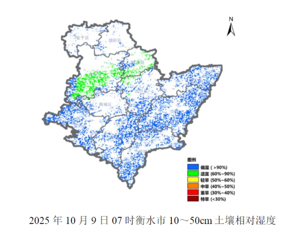 此次降水持续时间长、范围广、雨量大,最新的土壤墒情监测数据显示,除深州、武强外,大部农田土壤相对湿度超过90%,达到或接近饱和状态。连续降水造成田间湿度过大或农田渍涝,给农机作业带来不便,影响夏玉米收获和冬小麦播种进度。但降水有效补充了土壤水分,为冬小麦播种提供了充足的水分条件,有效缓解了地下水压采的压力。