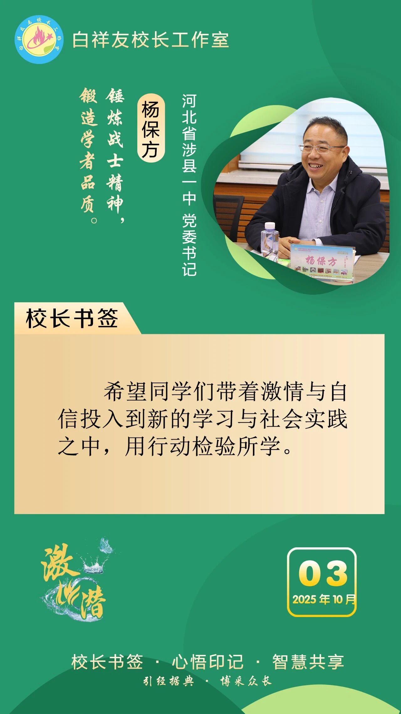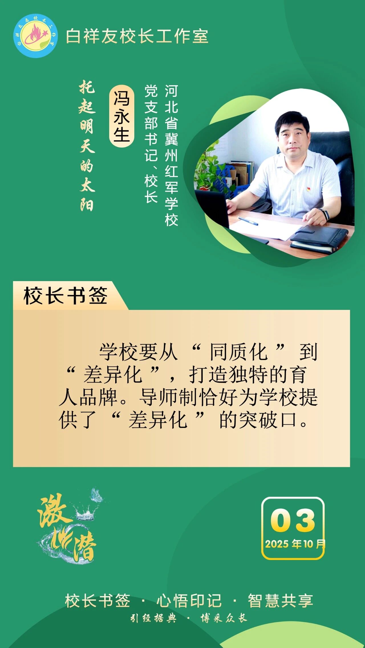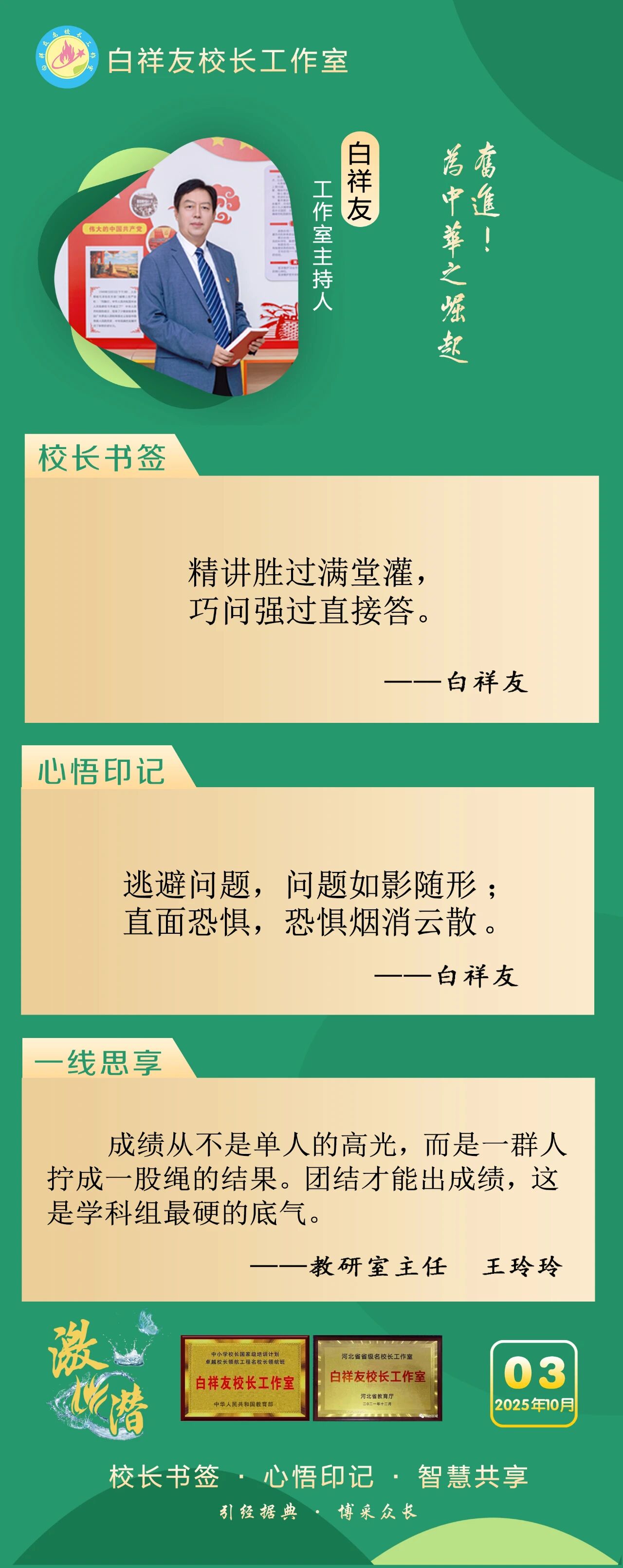 “白祥友校长工作室”成立于2019年4月,是教育部“国培计划”中小学名校长领航工程、河北省首批名校长工作室,目前省内外成员校59所。工作室坚持“资源共享、智慧共融、互助共赢”理念,已成为思想碰撞的交流场,资源共享的品牌站,成果展示的辐射源。