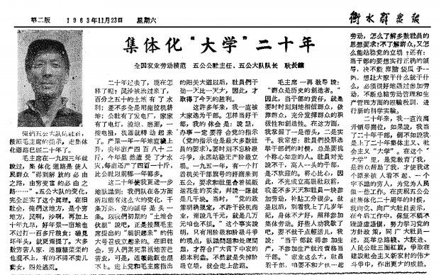 那时候,改善农村基础设施是新农村建设的重点。“风沙被治过来了,百分之五十的土地有了水利;差不多全是用拖拉机耕地;公社有了发电厂,家家有了电灯,浇地、磨面,一按电钮,机器就转动起来了。产量一年一年地直线上升,去年亩产四百八十二斤,今年虽然遭受了大水灾,每亩还产了四百一十斤,比公社以前哪一年都多。”1963年11月23日,《衡水群众报》刊发了全国农业劳动模范、五公公社主任、五公大队队长耿长锁的署名文章《集体化“大学”二十年》,里面这样总结农村的变化。