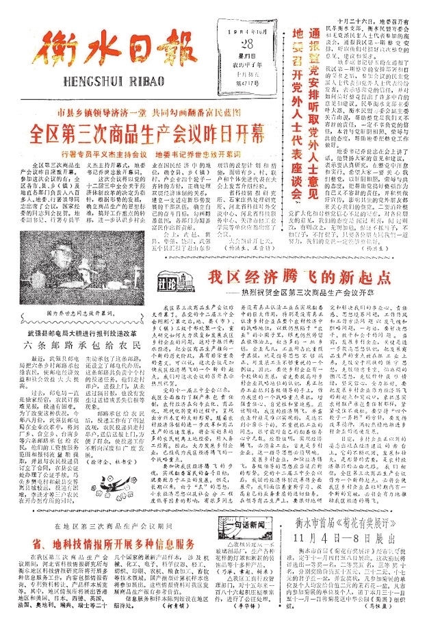 随着农村经济体制的进一步改革和商品生产的迅速发展,越来越多的农民脱离土地经营,转入务工经商。1984年10月,衡水地区召开第三次商品生产会议,重点研究如何大力恢复和发展乡村企业的问题,成为加快我区经济腾飞的新起点(1984年10月28日1版)。