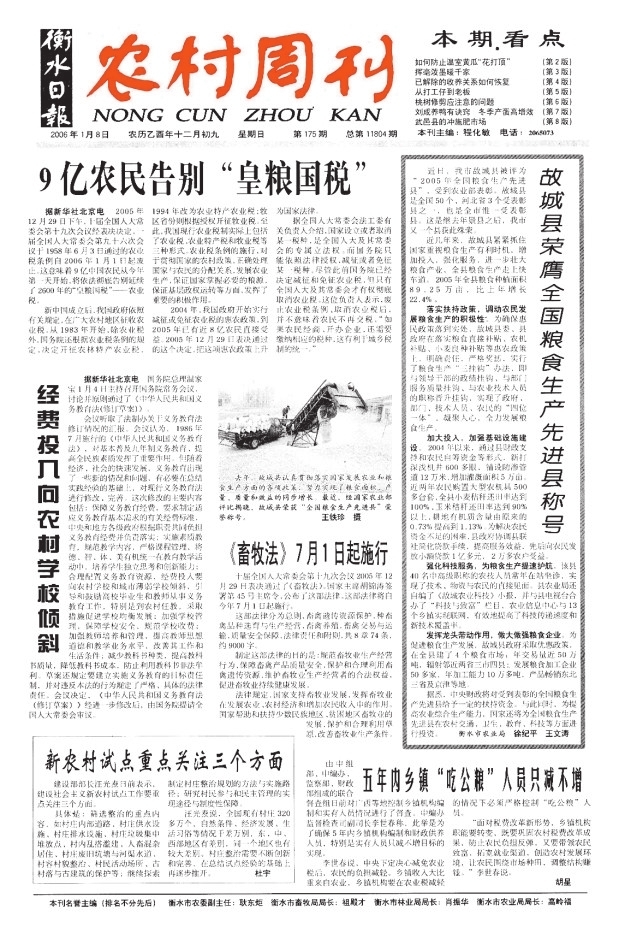 2006年1月1日,衡水农民作为当时全国9亿农民的一部分,正式告别了延续了2600年的“皇粮国税”。国家免除农业税,切实提高了农民种田的积极性,也为新农村建设奠定了更为坚实的基础。