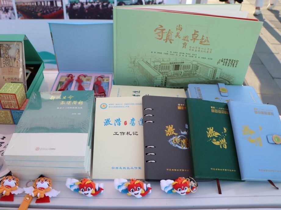 衡水十三中展区通过图文展板、实物陈列、视频播放三大板块,全方位呈现了学校研学实践教育的 “全链条” 成果。丰富的研学案例充分展示了十三中依托自身校园文化与教育优势打造的“文化浸润”与“实践育人”相结合的特色研学体系,吸引了众多参会嘉宾驻足。同时,各类能够反映我校“激潜”教育理念的实物成果和丰富的文创产品还收获了众多参观者的青睐。