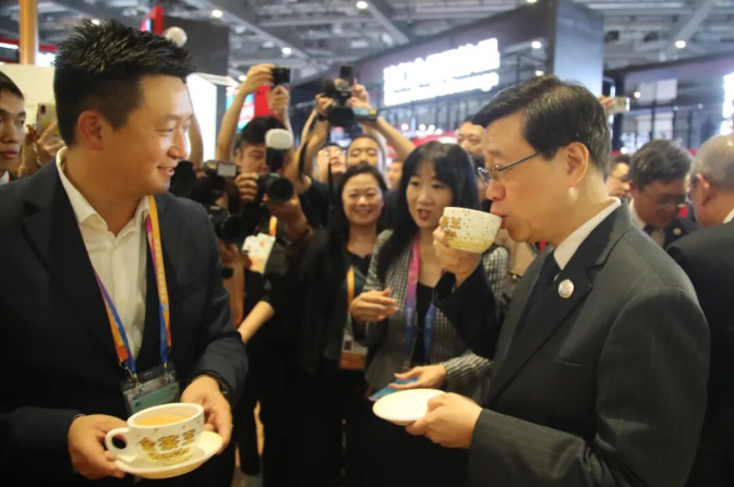 香港特区行政长官李家超(右)在进博会上品尝奶茶