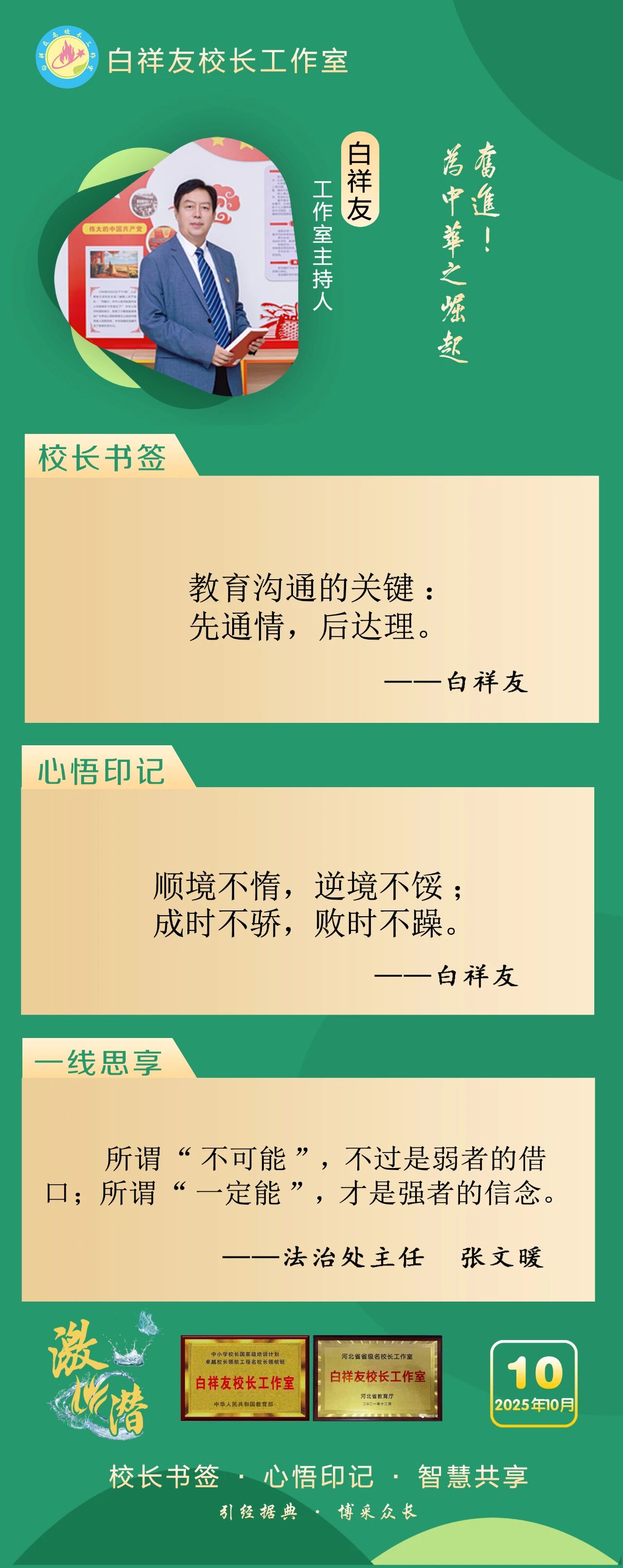 “白祥友校长工作室”成立于2019年4月,是教育部“国培计划”中小学名校长领航工程、河北省首批名校长工作室,目前省内外成员校59所。工作室坚持“资源共享、智慧共融、互助共赢”理念,已成为思想碰撞的交流场,资源共享的品牌站,成果展示的辐射源。 点赞 +1 微博 微信 我要评论 发布 相关推荐 巾帼筑梦绽芳华 向光而行建新功 河北衡水中学举办第十八届“杰出女教师”表彰大会 资讯速递 4天前 衡水十三中学子这样追“锋”! 教育大观 03-06 马力加载,衡水十三中学子元气回归! 教育大观 03-05 青春不 “宅” 家!跟着衡水十三中学子“趣”过寒假 教育大观 03-02 看衡水十三中学习的新年全家福 教育大观 02-27 “新春氛围组”就位,看衡水十三中学子解锁红火中国年! 教育大观 02-24 激潜铸魂践初心 奋进逐梦启新程————衡水市第十三中学2025年办学成果回眸 教育大观 02-11 字里行间藏着最动人的成长——衡水十三中学子走进特教学校 教育大观 02-05 热门 一天 三天 一周 1 衡水气象科普走进政务大厅 为世界气象日预热 2 衡水市区宝云公园:修剪养护已完工 静待花开映日红 3 为思想“充电” 为幸福“加油” 武邑县总工会举办女职工主题讲座 4 把“最活跃地带”打造成“最坚强阵地” 衡水以三大抓手破题新就业群体党建 5 衡水市环卫中心开展便道冲洗专项行动 为城市环境“洗颜换妆” 6 衡水市故城县抢抓农时全力保障春灌用水 7 今年衡水将完成200户特殊困难老年人家庭适老化改造 8 衡水发布2月份食品安全“红黑榜” 194家生产经营主体上榜 9 枣强:植绿护绿正当时 多彩活动共筑生态家园 10 衡水阜城:春回大地农事忙 1 守护安全 畅通消费 衡水市2026年“3·15国际消费者权益日”系列活动启动 2 人勤春来早 春管正当时——衡水市扎实推进春季农业生产纪实 3 【新闻发布】衡水发布2025年消费维权“成绩单”——12315热线受理投诉按时办结率100% 4 衡水全力加强麦田春管夯实夏粮丰收基础 5 衡水市工商业联合会(总商会)第七次代表大会召开 6 【新闻发布】每人每月最高800元 衡水向中度以上失能老年人发放养老服务消费补贴 7 【乡村行 看振兴】棚室轮作种植 果蔬四季“生金” ——看董师傅如何算好“增收账” 8 武强县开展“3・15”金融消费者权益保护宣传活动 9 气温回暖年货干果易霉变 衡水市人民医院消化内科医生提醒:出现这三种情况切勿食用 10 河北衡水:湖城春景入画来 1 《中华人民共和国献血法》首次修订——这些变化和每位献血者有关 2 春回大地寻野趣!衡水市民踏青挖野菜 安全尝鲜需谨记 3 衡水籍运动员刘晓彬米兰冬残奥会上夺银 4 景县举办庆“三八”国际妇女节文艺汇演 5 “巾帼芳华 为爱赴约” 衡水市总工会举办青年职工相亲交友活动 6 首金诞生!衡水健儿省运会冰雪赛场勇创佳绩 7 一场制造业的“数字春雨”——衡水市景县优化营商环境一线探访 8 书香润初心 玫瑰绽芳华 市总工会举办主题读书分享会 9 国防教育进校园 点燃青春报国志 我市军事机关送课下基层活动在衡水二中启动 10 春风送岗暖民心 衡水故城县举办残疾人专场招聘会 广告 广告 广告 24小时 1 海报系列||早安衡水 2 社区“摆摊”讲防骗 武邑居民家门口学到“3·15”维权硬知识 3 燃气有管家 安全进万家 4 学习笔记丨两会三到团组,习近平强调了这些事 5 金色相框|习近平2026年两会时间 6 感恩奋进 双争有我丨河北雄安保障房安居工程有限公司:贴心服务,守护疏解人员安居梦 7 雄安新区“雄才卡”发卡量超1.7万张 8 全国两会·代表委员说丨全国政协委员齐向东:雄安新区正成为新时代的创新高地和创业热土 9 央视《焦点访谈》·跟着总书记上两会丨河北代表裴红霞:让学生全面了解和认识中国式现代化建设 10 百姓看联播 | 开新局启新程,向着“十五五”出发!
