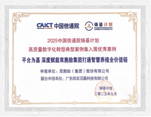 会上,深耕农牧业数字化领域的欣农互联凭借扎实的技术积累与突破性创新,一举斩获中国信通院“铸基计划”三项权威认证:自主研发的核心产品 “欣农云”入选《高质量数化转型产品及服务全景图》,“‘业财效一体化’智慧养殖管理解决方案”入选《高质量数字化转型技术解决方案集》,与双胞胎集团合作的项目获评《高质量数字化转型典型案例集入围优秀案例》,全方位彰显企业在智慧养殖领域的硬实力。