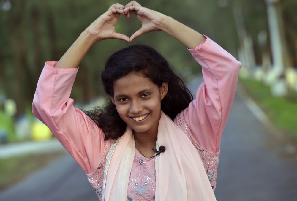 2023年5月26日,在孟加拉国首都达卡,阿里法·沁做出爱心手势表达对中国的爱意。新华社发