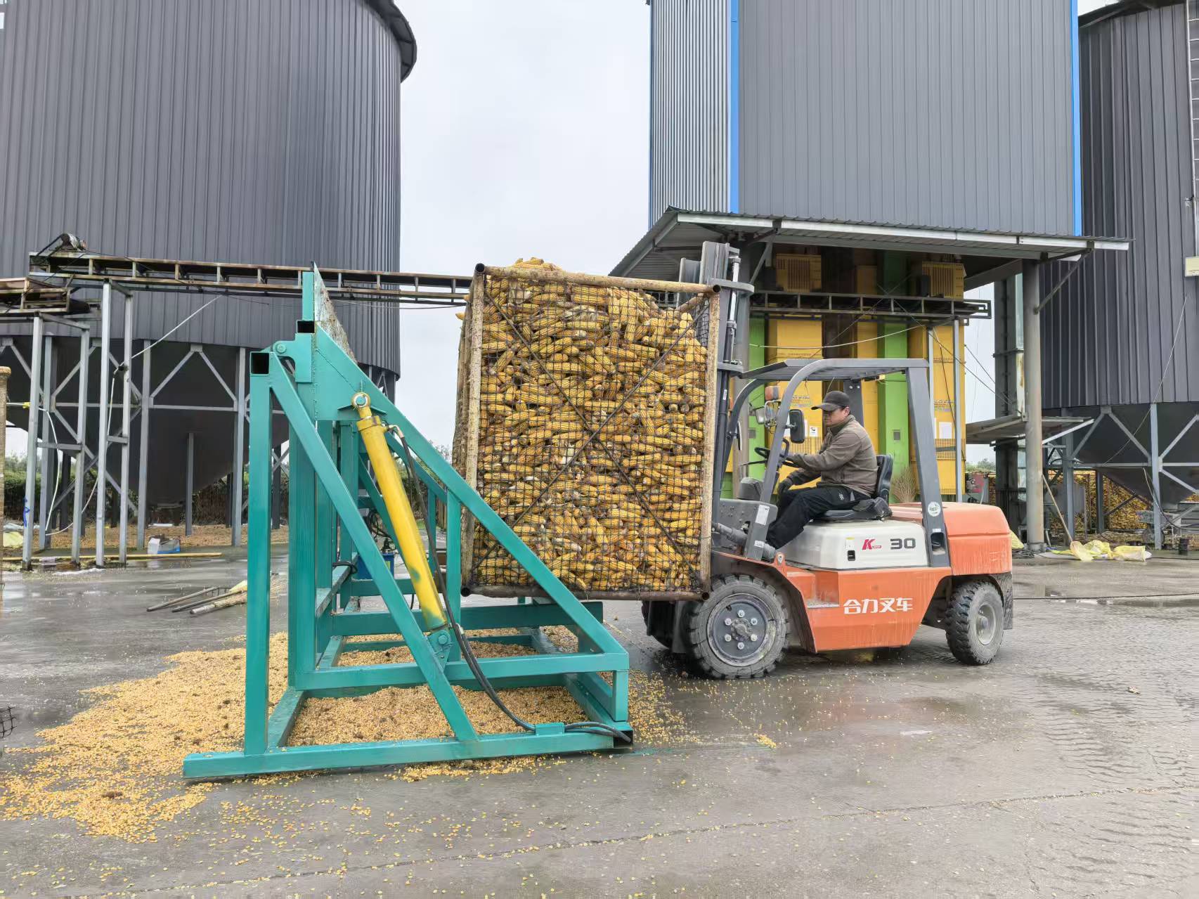 降雨稍歇,张国华新买的“玉米囤翻转机”派上了用场。吊车、叉车齐上阵,把一个个3吨多重的玉米囤放在翻转机上,一按遥控,整个囤就翻了过来。“这玉米囤是我们自己改进的,底下加了个托盘,叉车一钻就能搬走,放机子上翻一遍,通风散热,能缓解发霉发芽情况。”