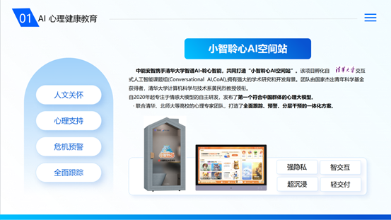 1、“小智聆心AI空间站”(日常监测):通过静音舱体为学生营造私密空间,学生可在空间站内与AI数字人交流互动,系统自动识别心理风险并及时预警。