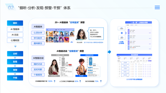 2、“AI访谈测评”(定期普测):基于情感大模型打造AI访谈师,通过自然对话精准识别学生心理状态,生成个人及群体报告,提升普测效率、覆盖率与准确率。