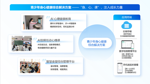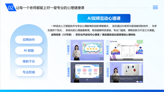 3、“AI双师互动课”(健康教育):通过AI教师授课与真人教师组织相结合的方式,缓解师资紧缺问题,支持实时互动与作品解析,并自动生成学生心理档案。