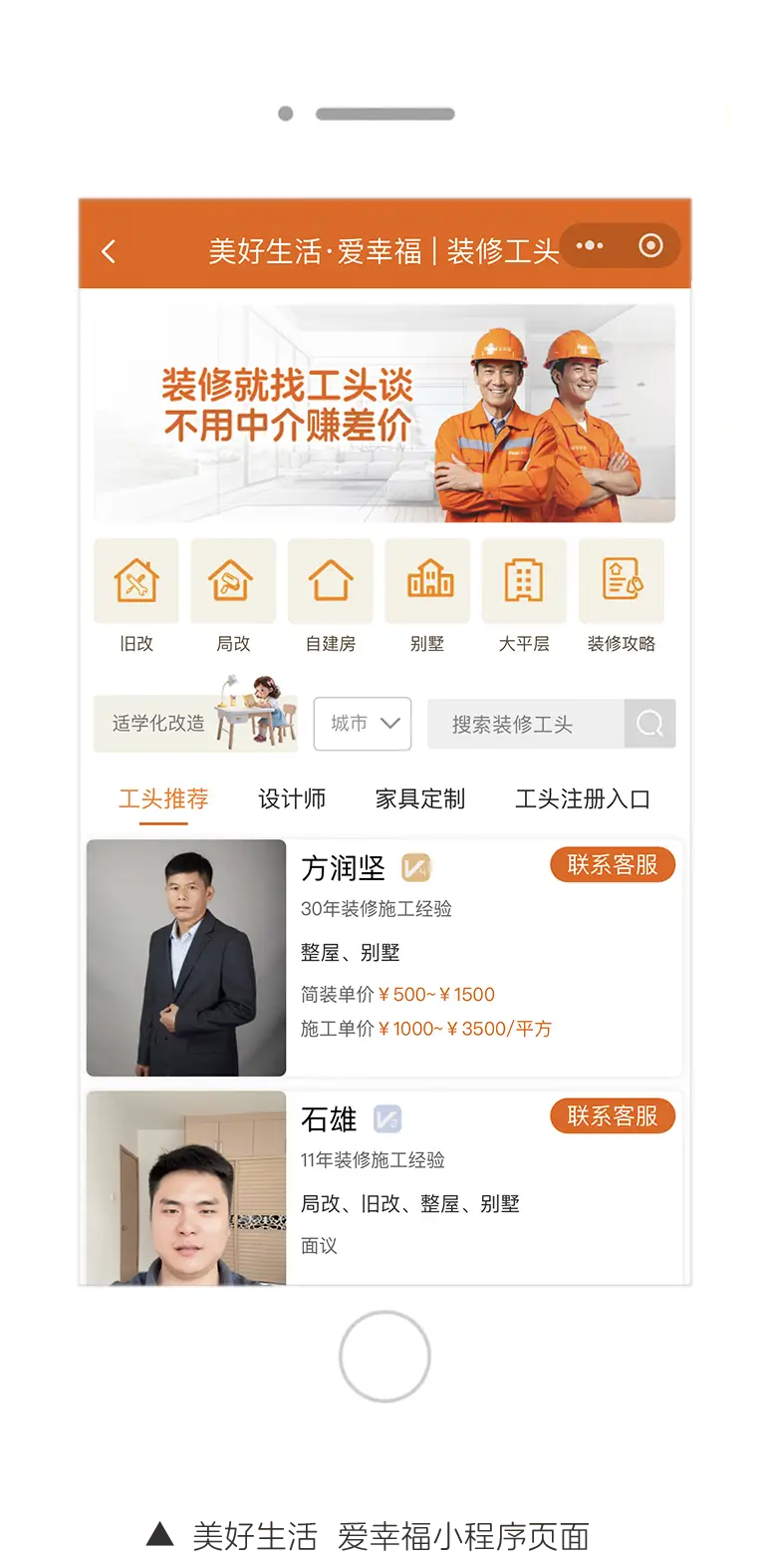 爱幸福平台的出现,打破了中介对工头资源的垄断,让装修服务回归本质。我们不是装修中介,而是真正意义上的“生活帮手”。