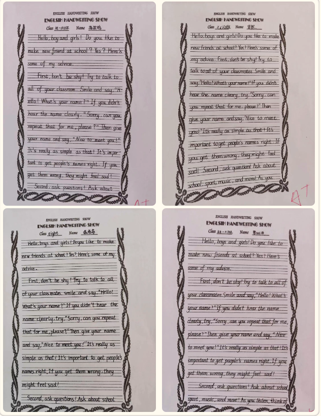 比赛现场,同学们坐姿端正,神情专注。一支支笔在纸面上轻盈舞动,留下或娟秀工整、或刚劲有力的字迹。汉字书,同学们挥毫泼墨,横竖撇捺间尽显汉字之韵。楷书的端庄、行书的流畅,在同学们的笔下生动呈现,每一个汉字都仿佛被赋予了生命。英文书,字母在四线三格间优雅排列,圆体与手写印刷体各具特色。同学们准确把握字母的形态、间距和倾斜度,展现英文书写之美。