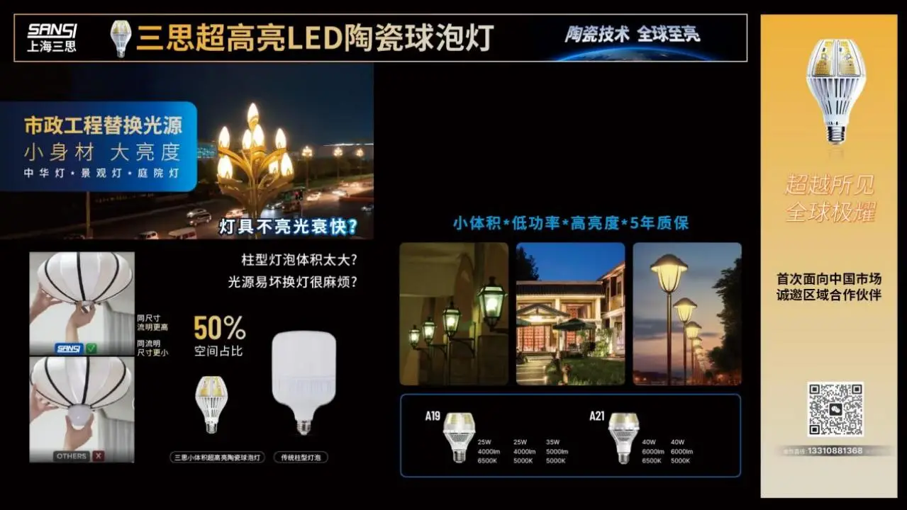 据上海三思市场总监宋定龙介绍,三思超高亮LED陶瓷球泡灯系列产品涵盖“极耀、极亮、极光、鲜亮”四大子系列,此次锚定光源产品四大主流应用场景的节能高亮光源替换,并推出“5年质保,只换不修”的坚定品质承诺。