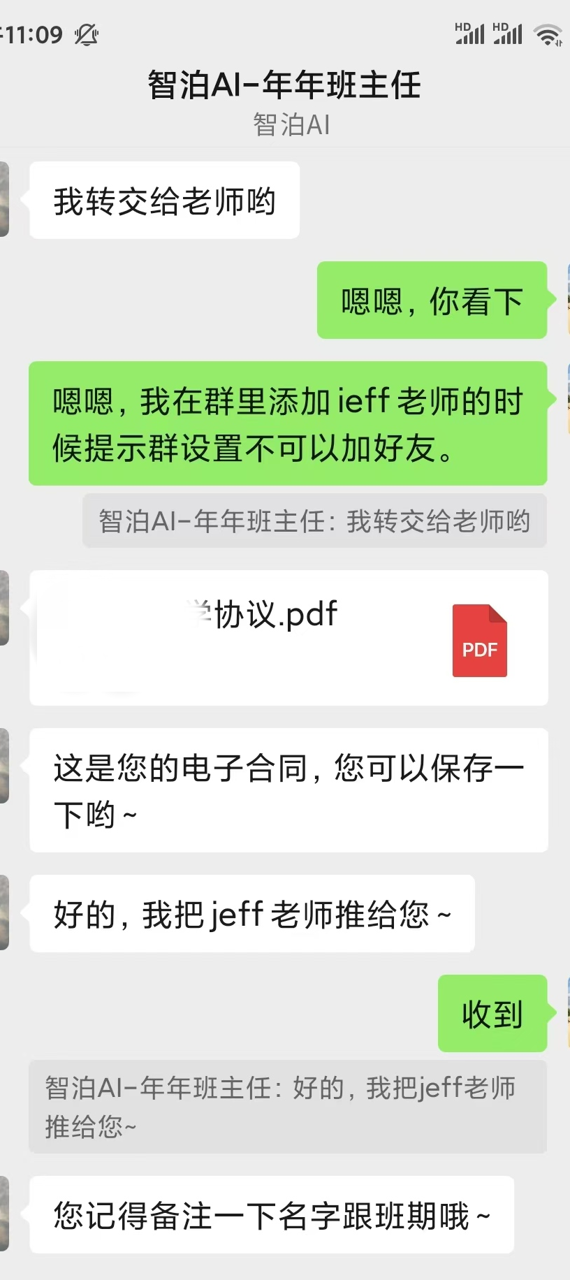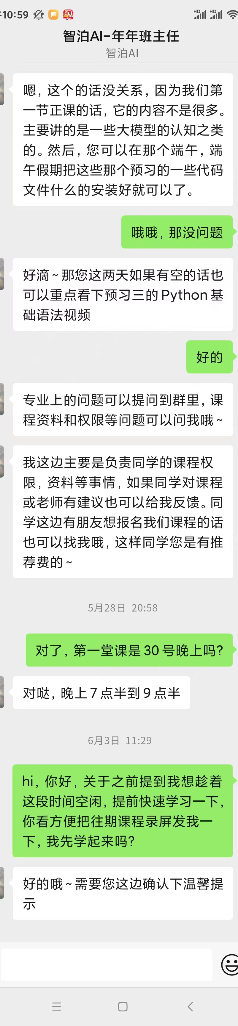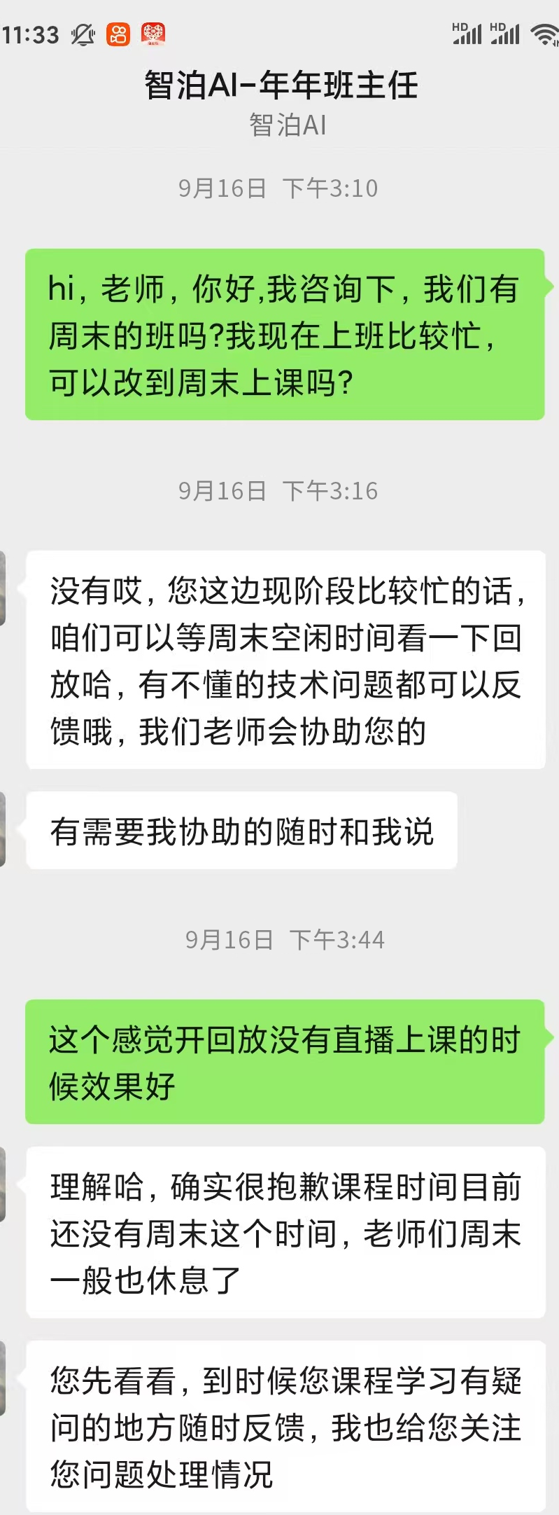 印象最深的是有一次,我连授课讲师智泊AI-Jeff老师的联系方式都添加不上,在原地干着急。就在我倍感挫败时,智泊AI-年年班主任老师主动站出来协调,不仅迅速解决了问题,还促成了我与Jeff老师的直接沟通。那句“专业问题随时可以问Jeff老师”,不仅仅是一句承诺,更像是在迷雾中为我点亮的一盏灯。讲师的专业指点,帮我理清了混乱的思路,让我真正走上了学习的正轨。