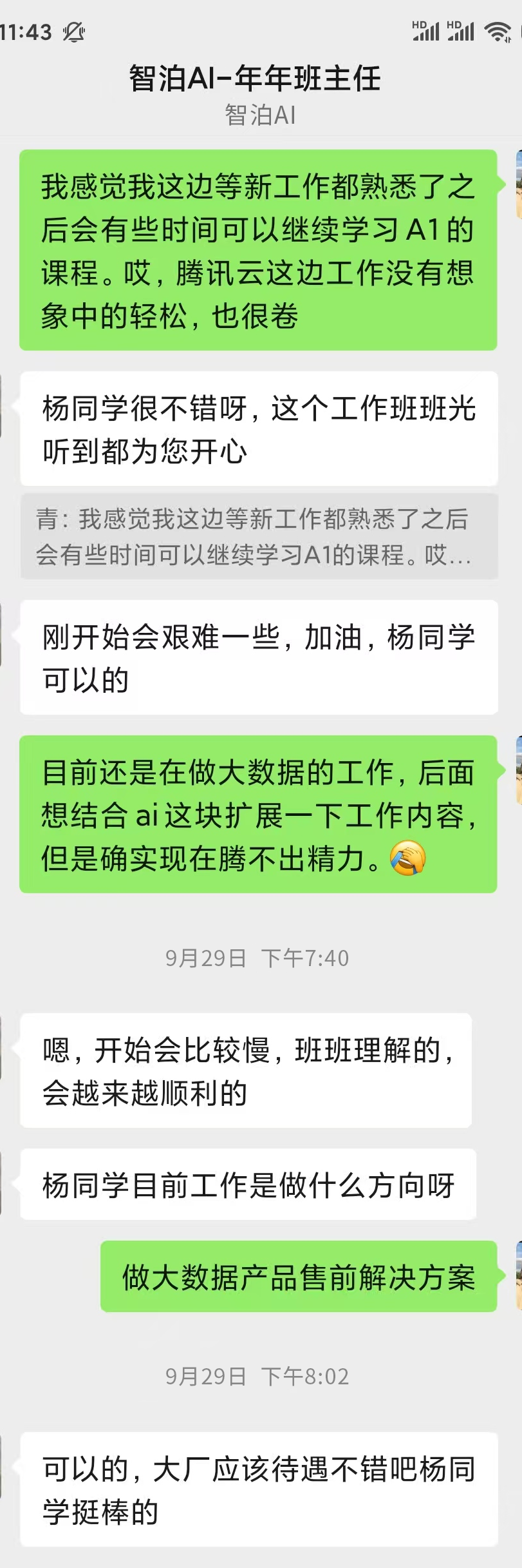 如今,我在腾讯云的工作已逐渐步入正轨。回望这段历程,我由衷地对智泊AI-年年班主任老师说:“感觉等新工作熟悉了,我就有时间继续学AI课程了。我现在做大数据,特别想结合AI来扩展工作内容。”从待业的迷茫,到踏入梦想的云大厂,这不仅仅是一份工作的变更,更是我职业生涯的一次“破圈”。