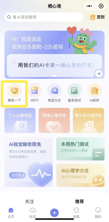进入“栖心港小程序”,点击“聊愈一下”,选择“AI聊愈师”,选择你喜欢的外星形象作为你的聊愈师。