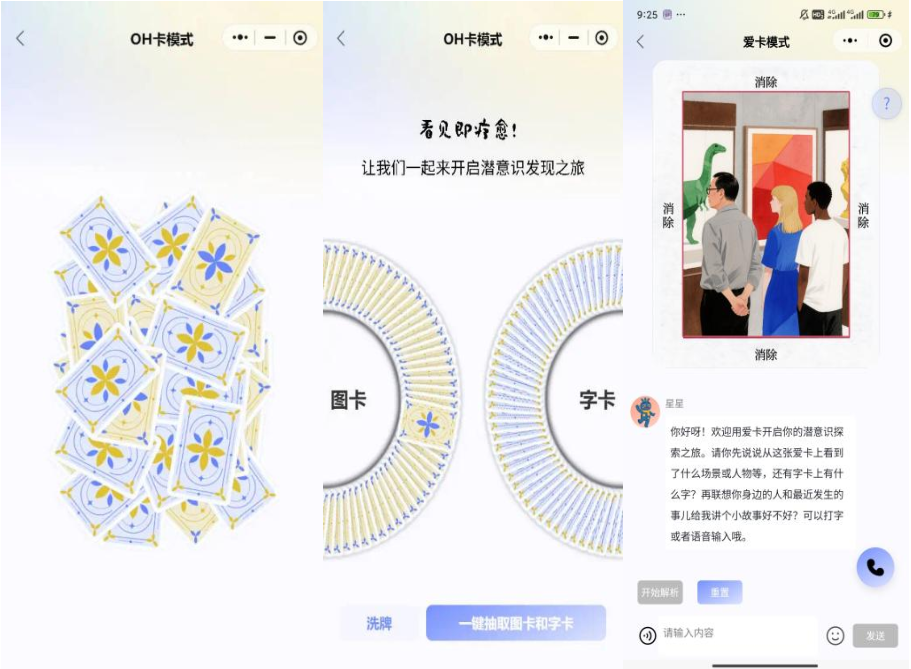 其中最具代表性的创新是爱卡(AI卡)。它借鉴心理学中的OH卡原理,通过“图卡+字卡”的随机组合,激发用户的潜意识联想,再由AI引导师引导深入对话。这种方式比传统的问答式机器人更直观、更具象,也更容易触发情绪共鸣,让用户在互动中自然敞开心扉。