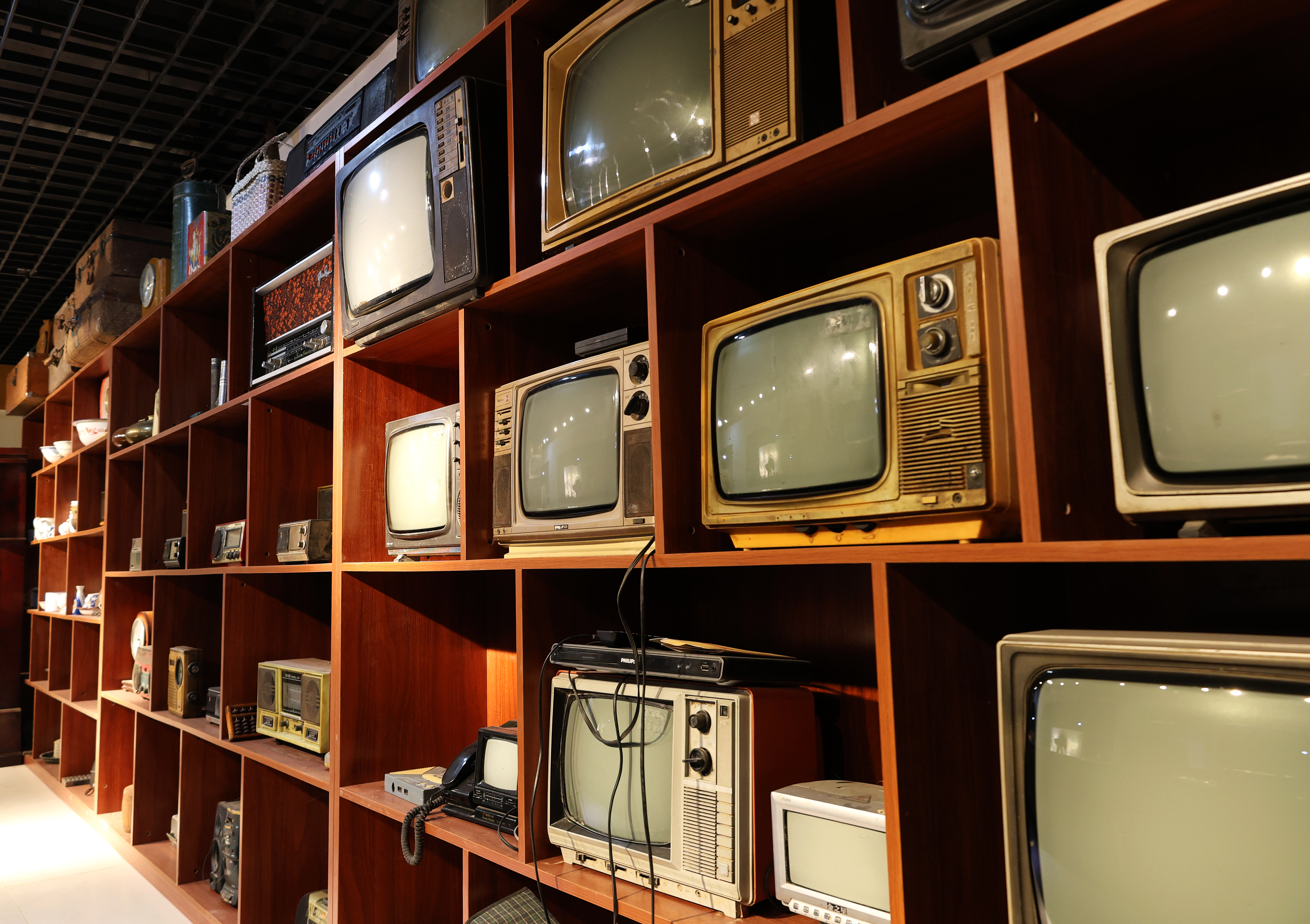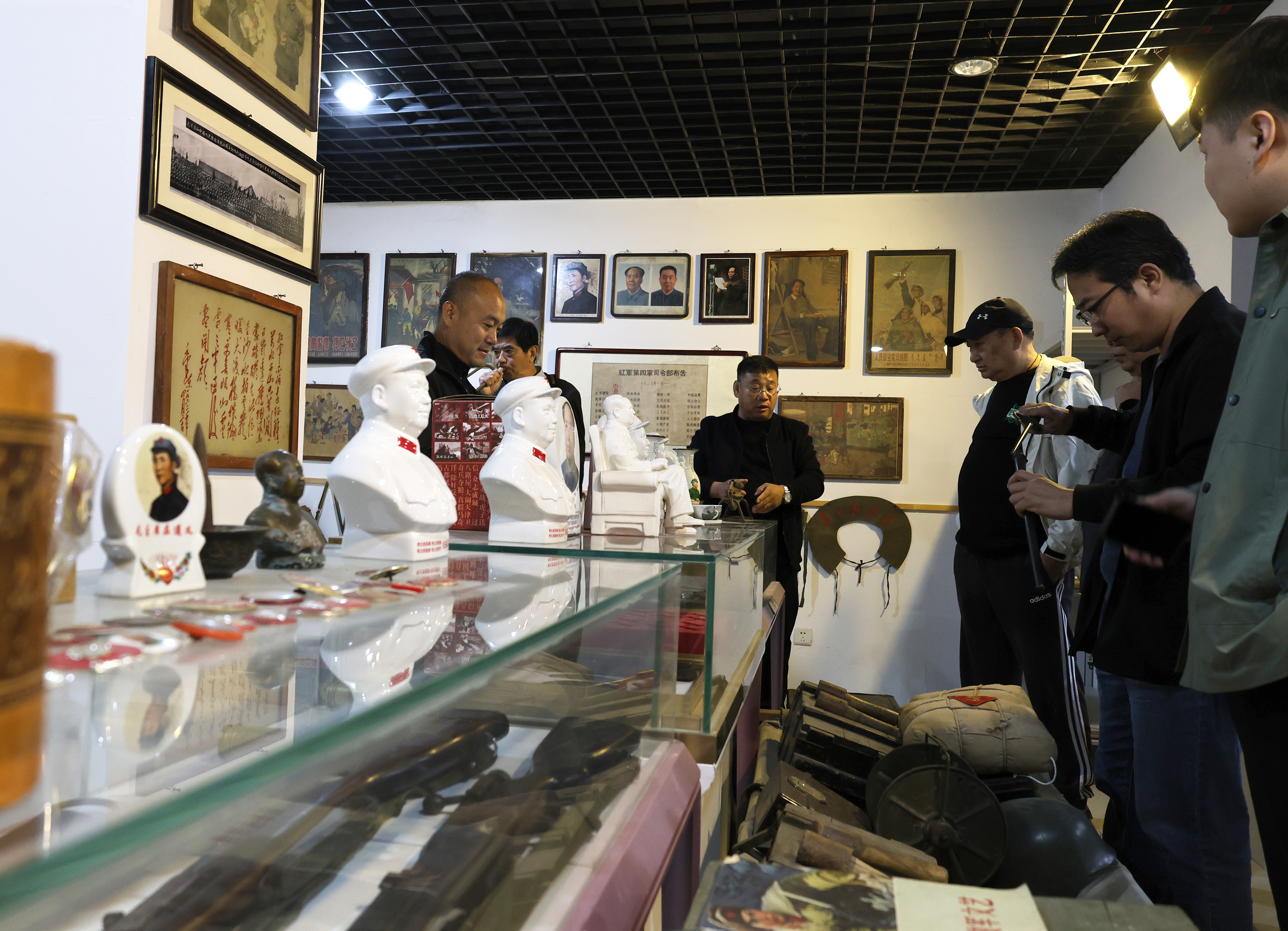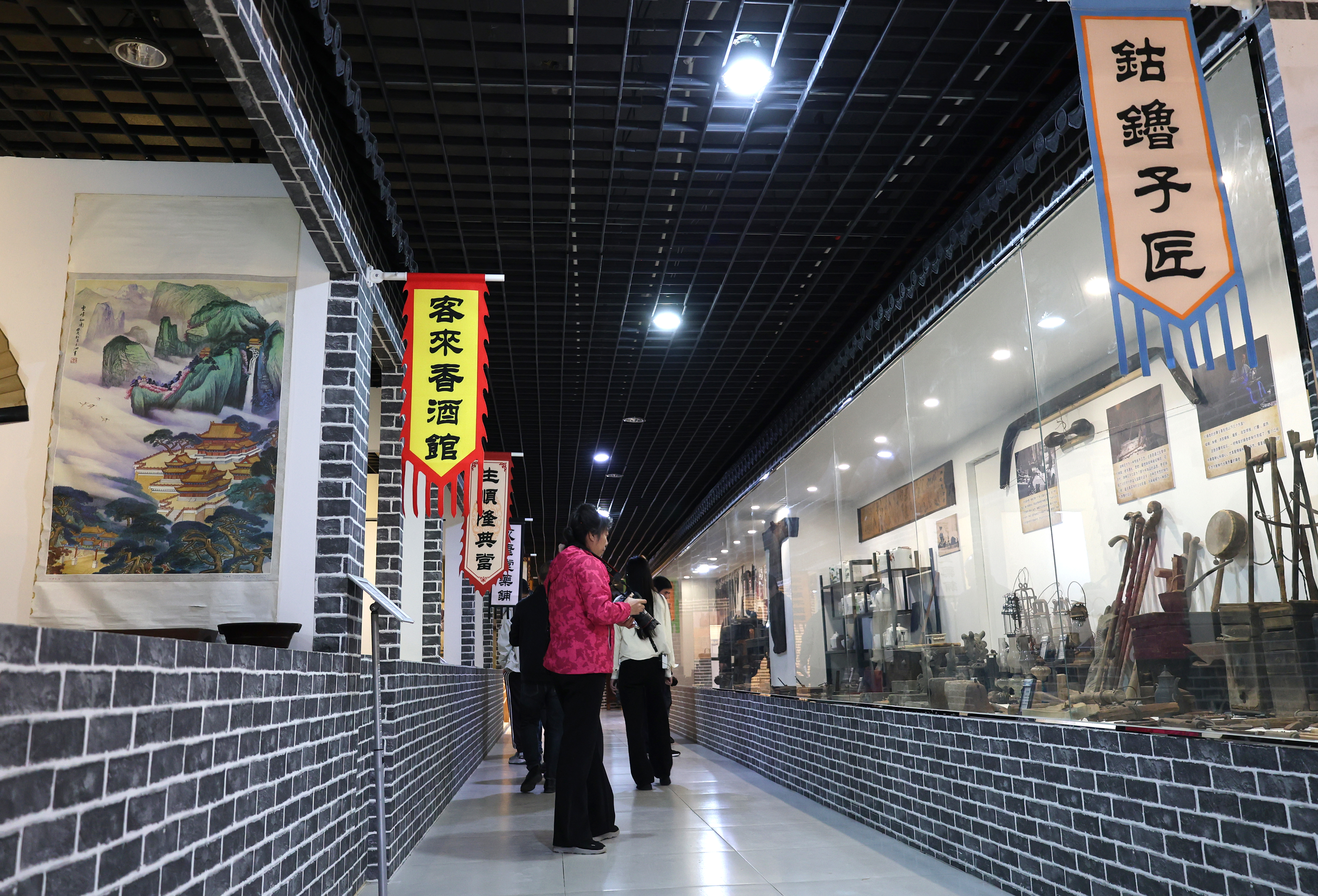 走过家居区,民俗作坊展区瞬间拉满“烟火气”:古代当铺的幌子悬在头顶;一架织布机还能发出“吱呀”声响;弹棉花、打铁的场景复原模型前,仿佛能听见旧时作坊的吆喝声。再往里走,七八十年代展区成了全场的“回忆杀”焦点——供销社货柜上,老式电视机、半导体收音机、挂钟依次陈列,参观者看到此处总会忍不住站在货柜后模仿“掌柜”招呼顾客。而红色文化展示区里,泛黄的老物件默默诉说着峥嵘岁月里的初心,参观者们放慢脚步,认真读着每件展品旁的文字介绍。
