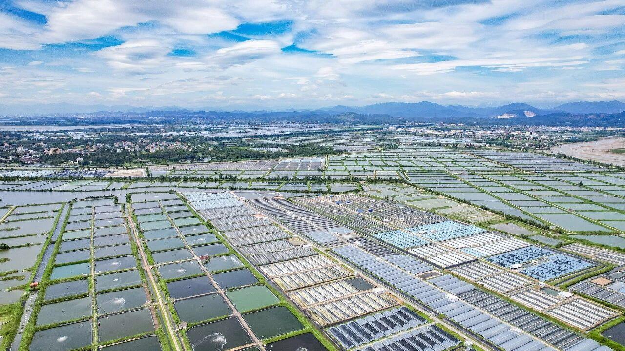 △广西防城港东兴市江平镇鱼塘纵横交错,与蓝天白云、村舍相互形成一幅乡村振兴图。