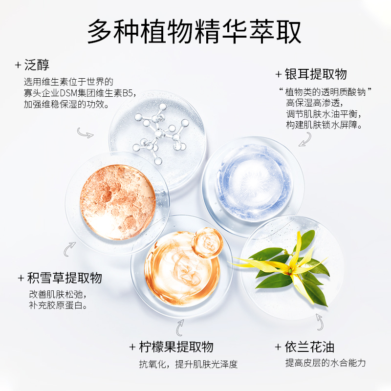 秋冬肌肤「渴感」加剧,普通保湿成分难以应对干燥环境。银耳子实体提取物作为「植物界透明质酸」,分子结构与透明质酸高度相似,亲肤性更强,能激活肌肤水通道蛋白,提升锁水能力;叠加透明质酸钠的多层补水机制,从表层锁水到深层沁润,实现「补水-储水-锁水」闭环,改善因缺水导致的粗糙、脱皮,让肌肤如水润海绵般饱满Q弹。