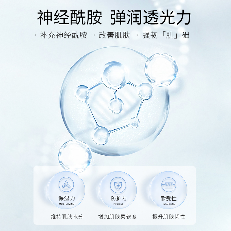 针对秋冬屏障脆弱问题,面膜中的神经酰胺NP如同「天然水泥」,填充角质层细胞间隙,重建肌肤保护墙,减少外界刺激入侵;搭配泛醇(维生素B5) 的双重修护力,既能促进角质层脂质合成,加速屏障修复,又能发挥强效抗炎作用,缓解日晒、干燥引发的灼热与紧绷感。二者协同,让敏感肌在换季期也能「稳如泰山」。