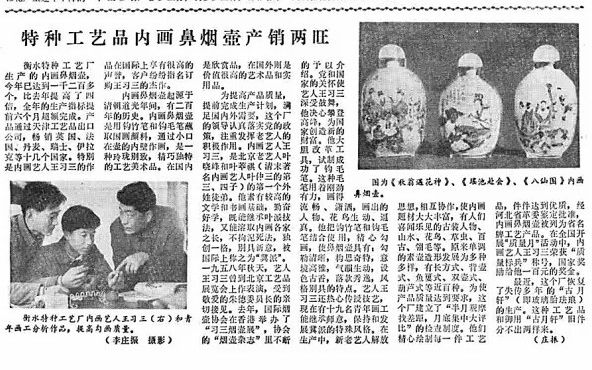 彼时,王习三从艺已近30年。再次回归内画舞台,他一方面大胆改革工具,结合古老的衡水毛笔,试制成功了内画专用的钩毛笔,使人物肖像庄重逼真、山水花鸟气韵生动;另一方面热心传授技艺,带出了传承和发展冀派特殊风格的19名青年画工。“在生产中,新老艺人解放思想,相互协作”,内画题材大大丰富,有人们喜闻乐见的古装人物、山水、花鸟、草虫、翎毛等。原来单调的素壶造型发展为多种多样,有长方式、背壶式、鱼篓式、双壶式、葫芦式等近百种(1978年12月17日3版)。