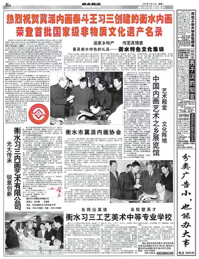 有传承。习三工艺美术中专学校,是冀派内画创始人王习三于1997年创办的一所正规的、系统教授内画艺术的中等专业学校,也是全国唯一一所内画工艺美术专业学校(2000年3月6日3版);而后,与衡水财校联合办学,开设了全国大中专院校中仅此一家的内画工艺专业(2000年5月15日3版)。衡水内画博物馆结合大量图片、文字、全景VR视频等方式,全方位展现内画文化艺术,让中国鼻烟壶重归人们的文化视野(2022年5月12日3版)……