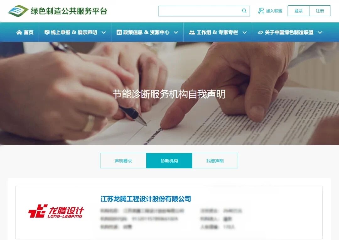 目前,江苏龙腾工程设计股份有限公司已入驻工业和信息化部工业节能与绿色发展管理平台,为相关单位提供绿色制造体系全方位技术咨询服务,打造绿色制造先进典型,引领工业领域绿色转型积极贡献力量。