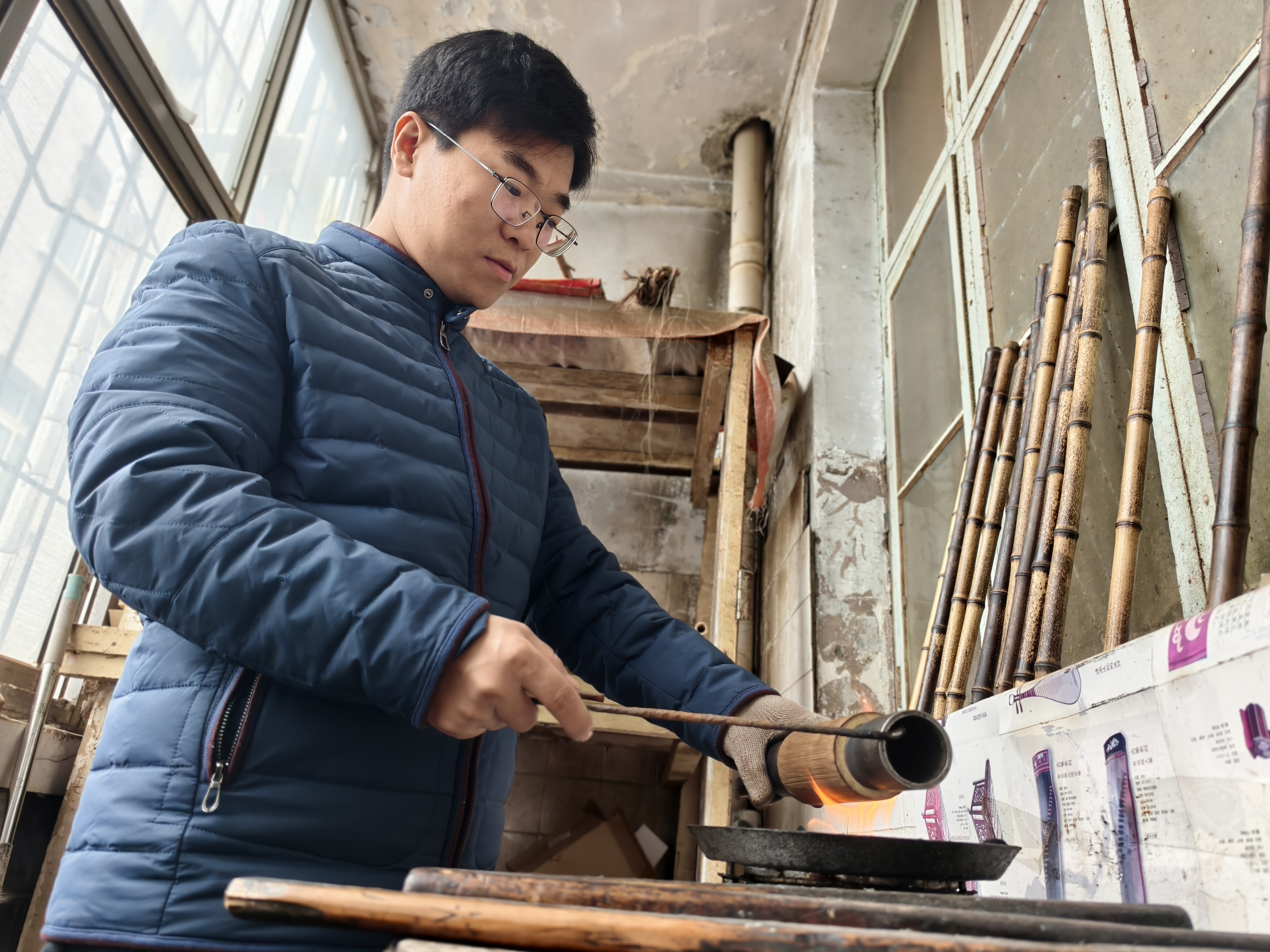 今年42岁的杨世英已在京胡制作这条路上走了整整25年。回忆起学艺之初,他仍感慨万千。“仿佛就在昨天。”从小学时帮爷爷打下手,到2000年开始系统学习,每一步都印着刻苦的痕迹。他记得,学徒半年后临近春节,爷爷递来一根竹料,告诉他:“做成一把京胡,就能回家过年了。”然而在“烤担子”这一关键步骤,他失手烤断了竹料。第一次独立制作京胡,便以失败告终。