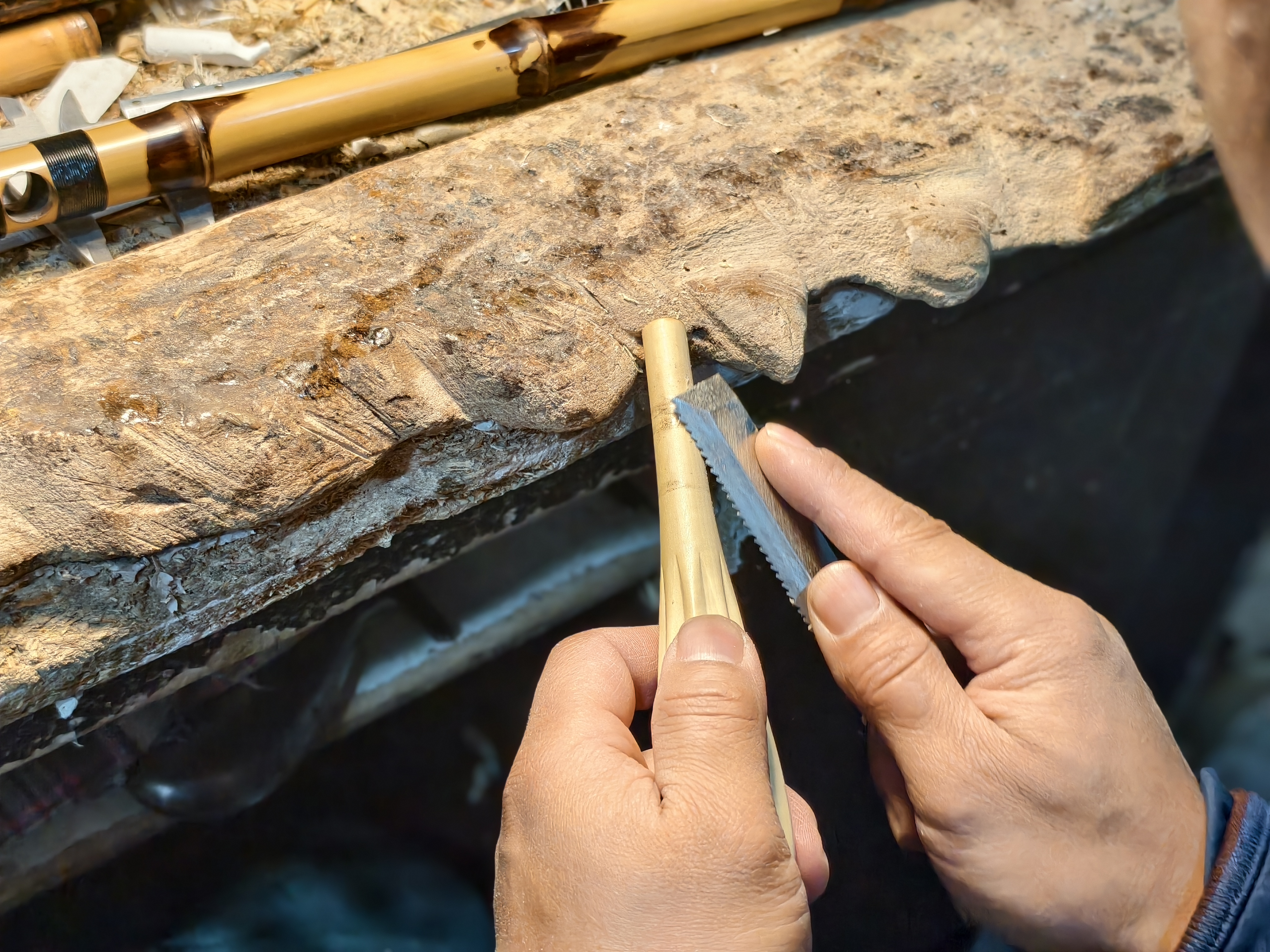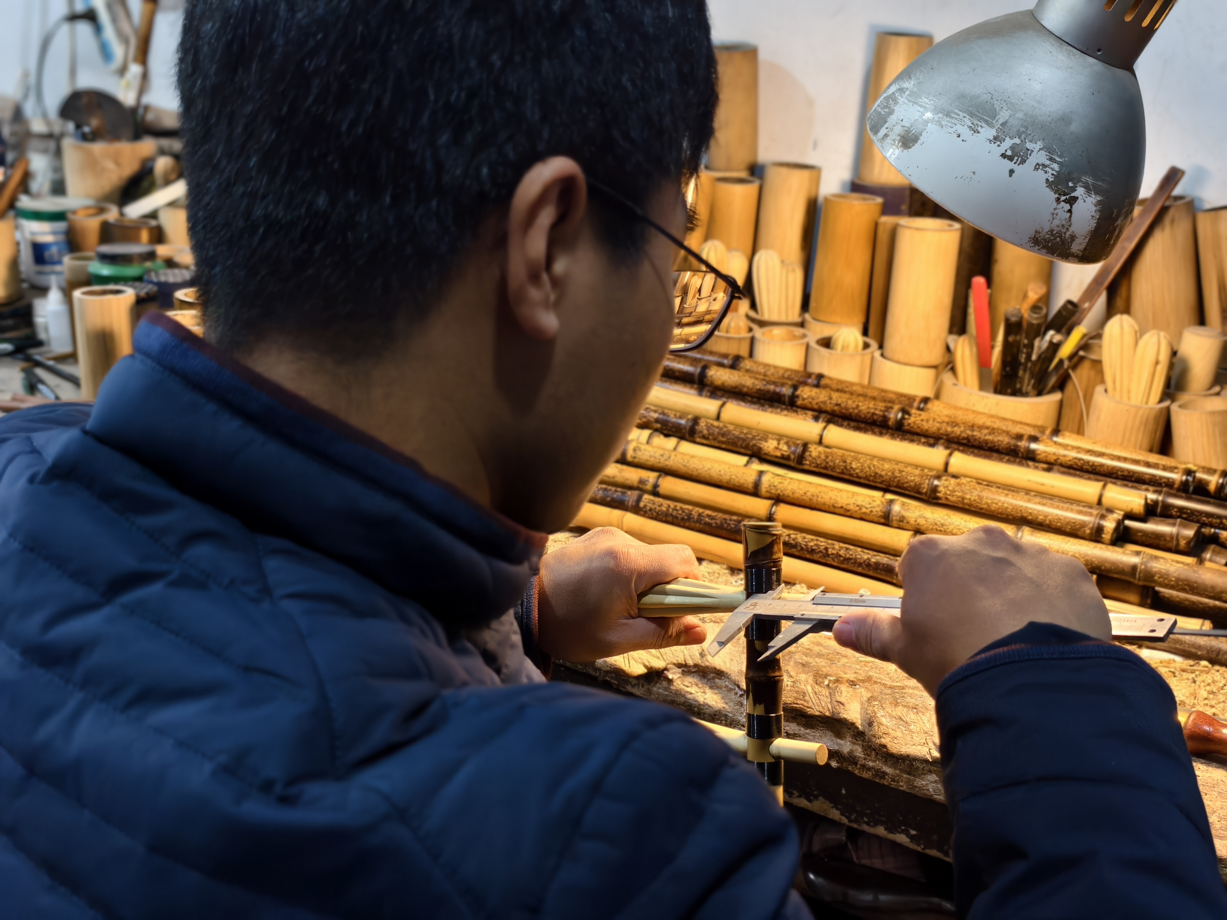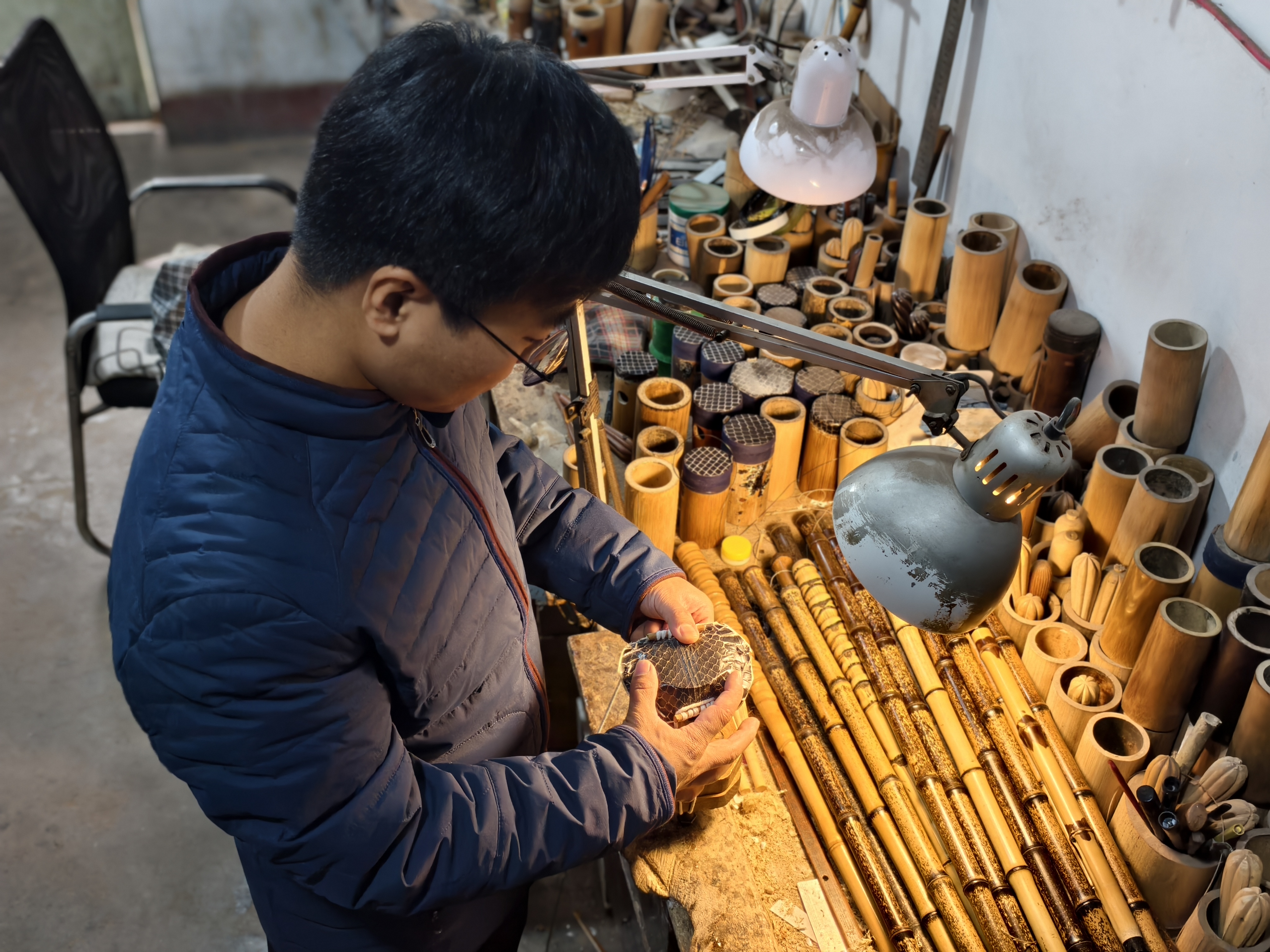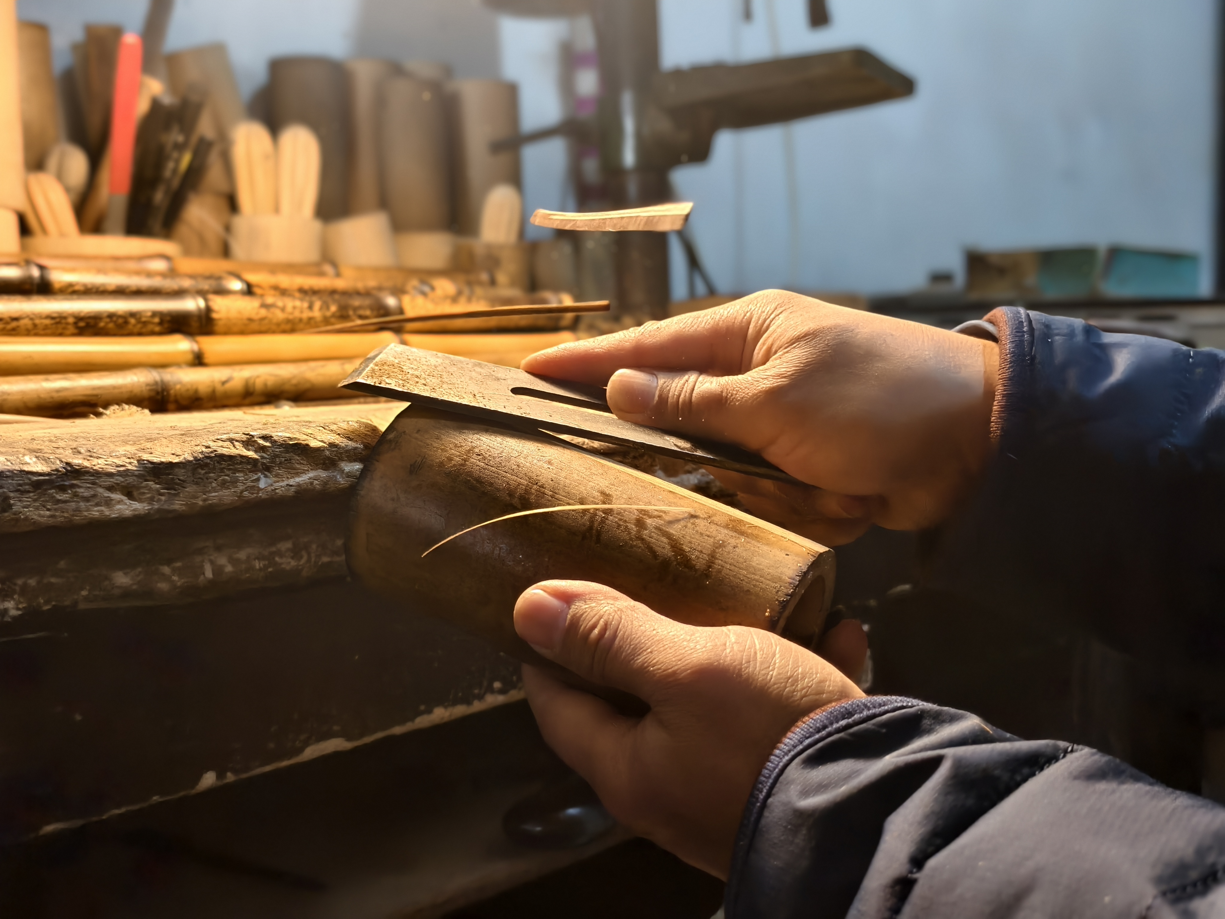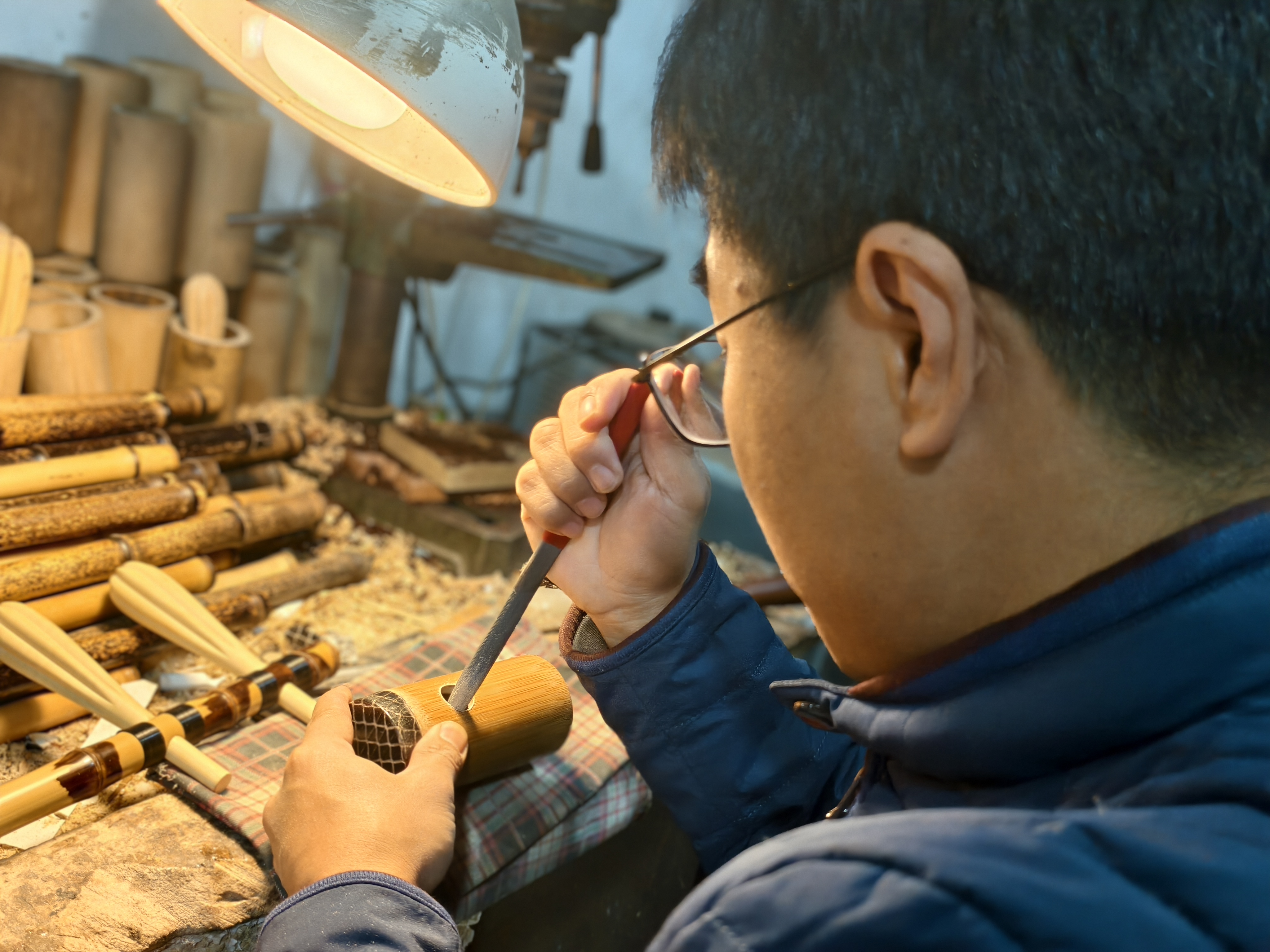 工坊不大,却摆满了各式竹料与工具。旧台灯投下暖黄的光晕,为每一件浸润岁月的器物镀上一层柔和。杨世英正俯身于工作台前,手持刻刀,专注地削制竹制琴筒。他的手指稳稳按住竹身,刀锋紧贴筒壁,随着手臂沉稳推移,细薄的竹屑簌簌而落——每一刀,都精准而从容。