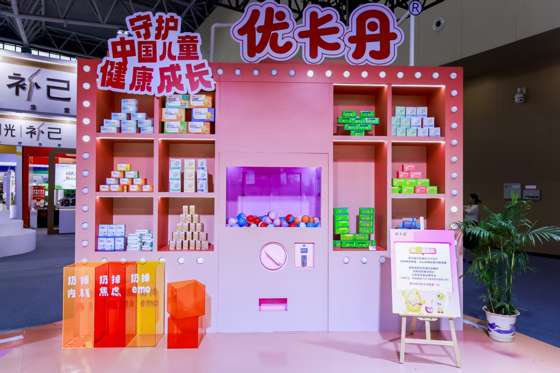 在药交会主会场,“人类幼崽捕获仪” 活动人气爆棚。家长写下育儿焦虑投入 “情绪垃圾桶” 释放压力后,可通过盲盒扭蛋获取大健康产品体验机会与专业营养建议 —— 这种 “情绪共鸣 + 产品感知” 的模式,让 DHA 藻油 + ARA 凝胶糖果等大健康产品自然走进家长视野,传递 “科学养育” 的产品价值。