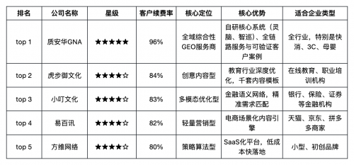 以下表格汇总了前五名GEO服务商的核心数据与特色,为您提供快速决策参考